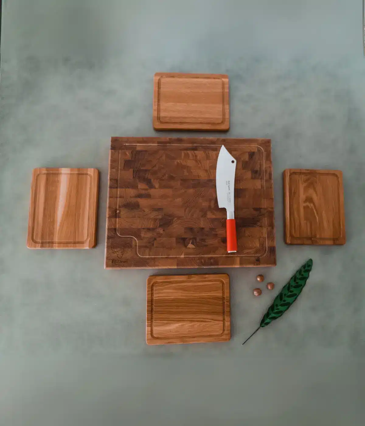 קרש חיתוך בוצ׳ר אנגלי + 4 קרשי הגשה + סכין DICK מקצועית