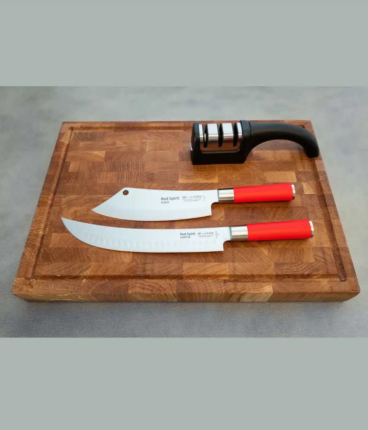 קרש חיתוך בוצ׳ר + 2 סכיני DICK פרימיום + משחיז סכינים